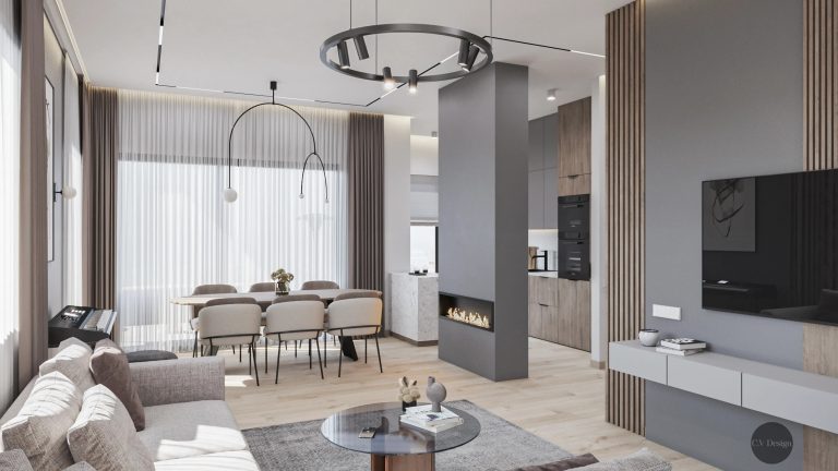 Phòng khách là trung tâm giao tiếp và thể hiện cá tính gia chủ. Phòng khách thường được thiết kế sang trọng, sử dụng màu trung tính, điểm nhấn ánh kim, kết hợp chất liệu như đá tự nhiên, gỗ cao cấp và ánh sáng tinh tế tạo nên không gian sang trọng với giá trị thẩm mỹ cao.